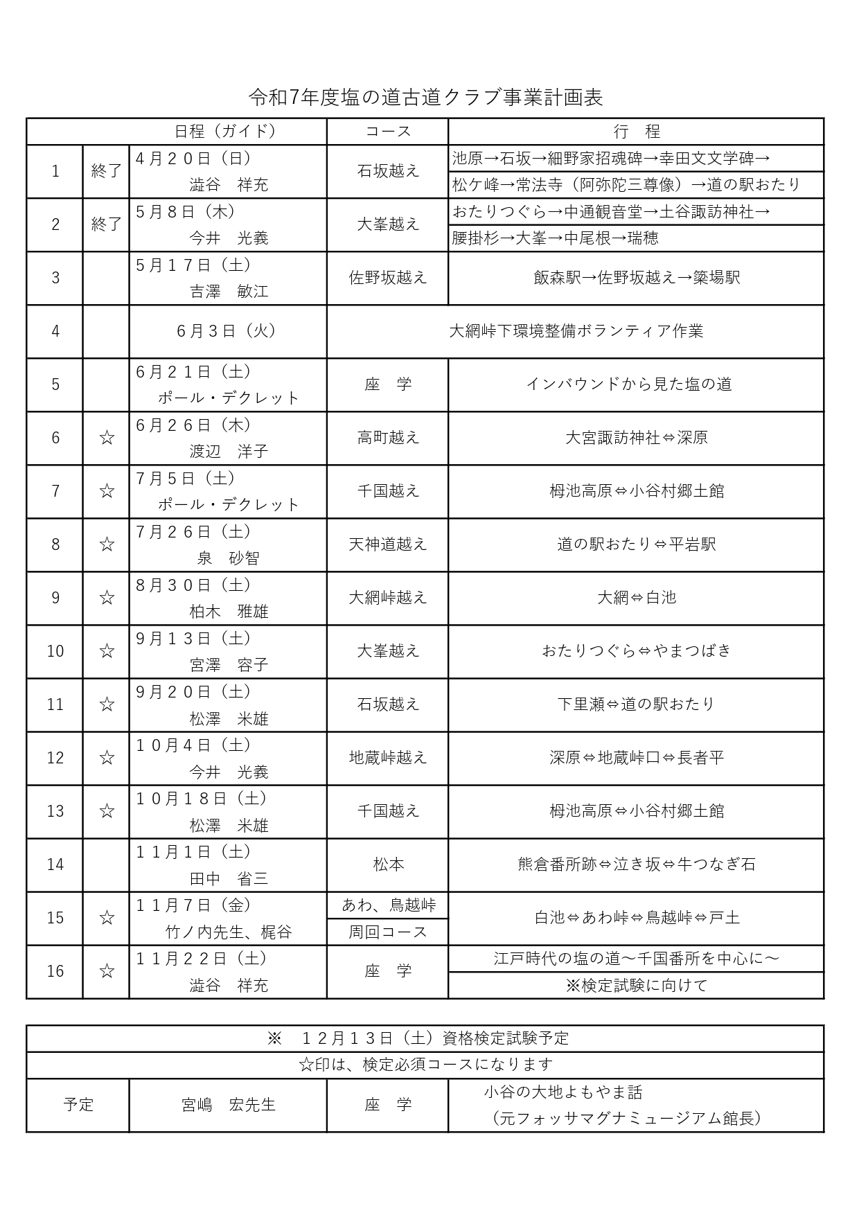令和7年度 塩の道古道クラブ事業計画表